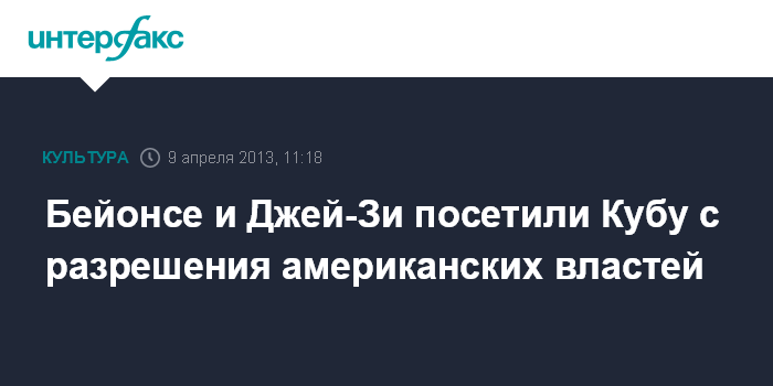 Вашингтон. 9 апреля. INTERFAX.RU - Известная американская певица Бейонсе и рэпер Джей-Зи побывали на Кубе с официального разрешения министерства финансов США, сообщают во вторник американские СМИ.