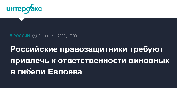 Москва. 31 августа. INTERFAX.RU - Российские правозащитные организации требуют привлечь к ответственности виновных в гибели руководителя сайта "Ингушетия.ру" Магомеда Евлоева, который умер в воскресенье от огнестрельного ранения.