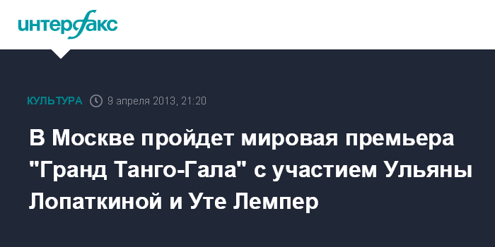 "В Театре оперетты Ульяна Лопаткина совместно со "Звездами мирового балета" и певица Ута Лемпер совместно с Пьяццолла-квинтет из Аргентины впервые представят совместный проект - "Гранд Танго-Гала", посвященный 90-летию со дня рождения аргентинского композитора Астора Пьяццолла", - сообщили организаторы концерта "Интерфаксу".