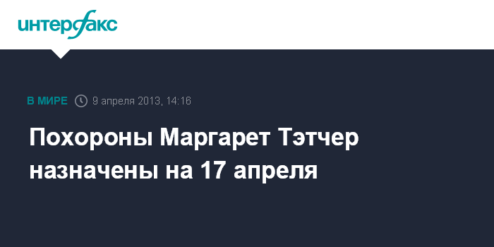 Лондон. 9 апреля. INTERFAX.RU - Похороны скончавшейся накануне Маргарет Тэтчер состоятся 17 апреля в Соборе святого Павла в Лондоне.