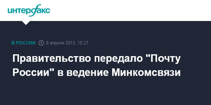 Москва. 9 апреля. INTERFAX.RU - Правительство РФ передало ФГУП "Почта России" в ведение Минкомсвязи. Соответствующее распоряжение от 6 апреля опубликовано на сайте кабинета министров во вторник.
