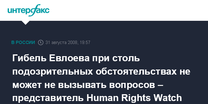 Москва. 31 августа. ИНТЕРФАКС - Международная правозащитная организация Human Rights Watch призывает расследовать обстоятельства гибели в Ингушетии руководителя оппозиционного сайта "Ингушетия.ру" Магомеда Евлоева.