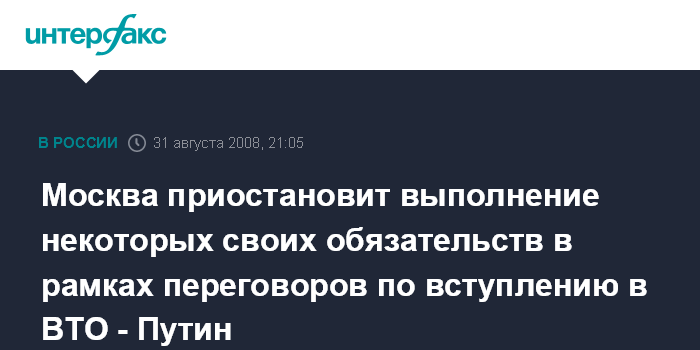 Москва. 31 августа. ИНТЕРФАКС - Россия намерена приостановить выполнение некоторых обязательств в рамках переговоров по вступлению в ВТО в области сельского хозяйства и промышленности, заявил премьер- министр РФ Владимир Путин.