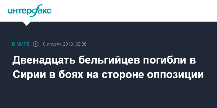 Брюссель. 10 апреля. INTERFAX.RU - Как минимум, 12 бельгийских подданных убиты в Сирии в ходе военных действий на стороне повстанцев, заявил в интервью, опубликованном в среду фламандским еженедельником Knack, имам, не пожелавший открывать свое имя.