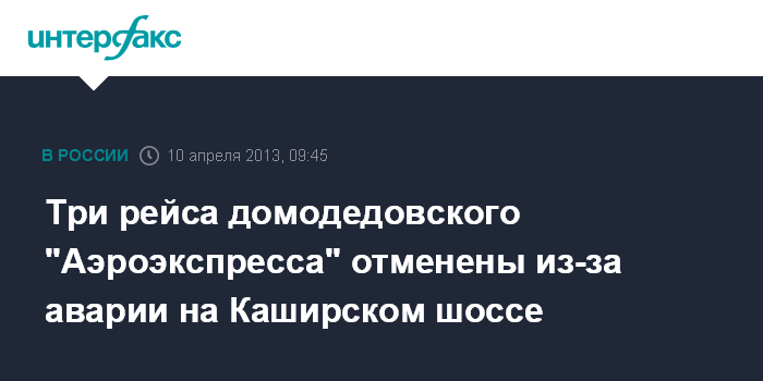 "В связи с аварией на пути следования "Аэроэкспресса" по маршруту "Павелецкий вокзал - "Домодедово" были отменены рейсы на 6:30, 7:30, 8:30. В настоящее время поезда следуют с опозданием на 10-15 минут", - сказал сотрудник пресс-службы "Интерфаксу" в среду.