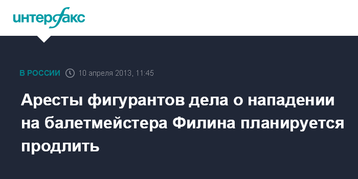 Москва. 10 апреля. INTERFAX.RU - Срок следствия по делу о нападении на худрука балета Большого театра Сергея Филина будет продлен на следующей неделе, сообщили в ГУ МВД по Москве.
