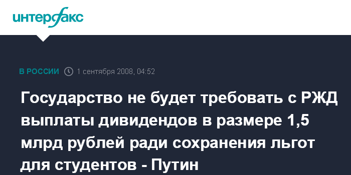 Государство не будет требовать с РЖД выплаты дивидендов в размере 1,5 млрд рублей ради сохранения льгот для студентов - Путин