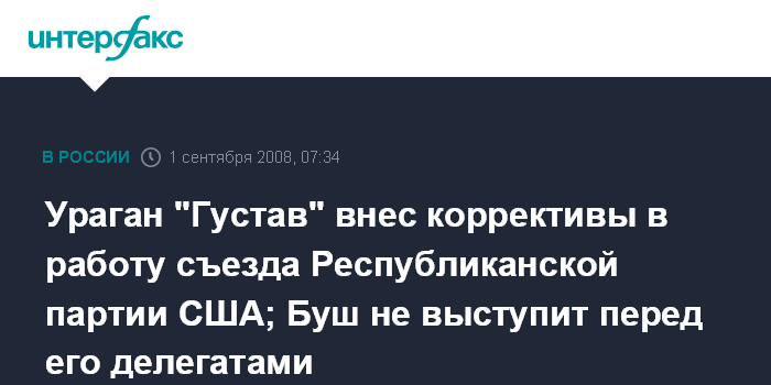 Ураган "Густав" внес коррективы в работу съезда Республиканской партии США; Буш не выступит перед его делегатами
