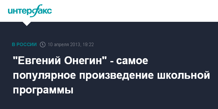 Москва. 10 апреля. INTERFAX.RU - Большинству россиян (81%) в школе нравилось изучать литературу, самым читаемым произведением оказалась поэма А.С.Пушкина "Евгений Онегин": ее прочитали 83% россиян, сообщают социологи Фонда "Общественное мнение".