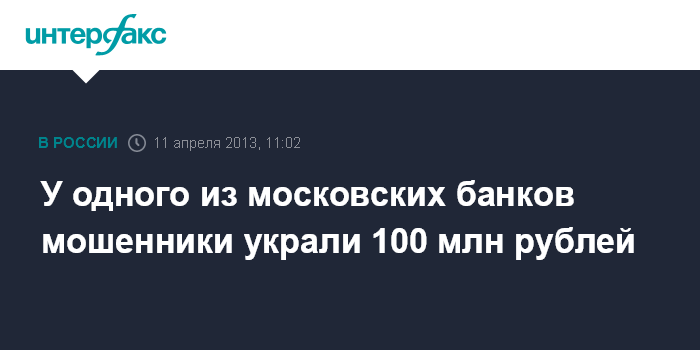 Москва. 11 апреля. INTERFAX.RU - Столичная полиция выясняет, кто и каким образом похитил из одного из московских коммерческих банков 100 млн рублей, сообщили в пресс-службе ГУ МВД по Москве.