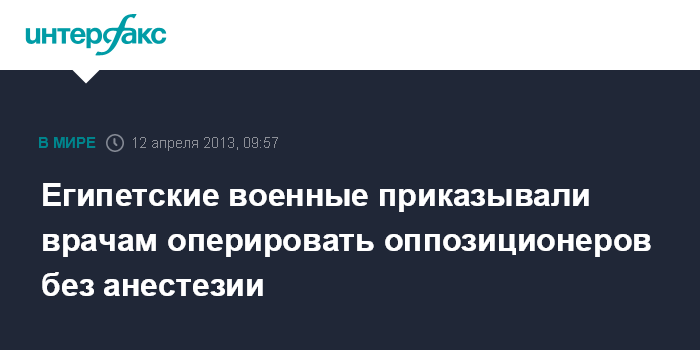 Лондон. 12 апреля. INTERFAX.RU - Египетские военные во время пребывания у власти приказывали врачам оперировать раненых в ходе демонстраций оппозиционеров без использования обезболивающих, сообщила в пятницу британская газета Guardian.