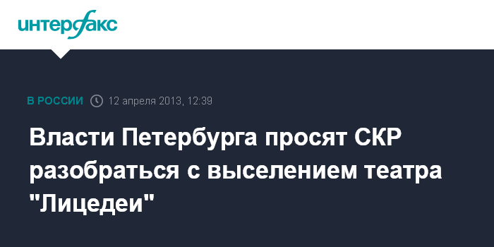 Санкт-Петербург. 12 апреля. INTERFAX.RU - Власти Петербурга намерены обратиться в Следственный комитет с просьбой разобраться в ситуации вокруг здания театра "Лицедеи".