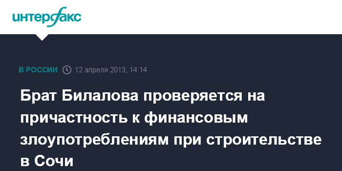 Москва. 12 апреля. INTERFAX.RU - Предприниматель Магомед Билалов - брат бывшего вице-президента Олимпийского комитета России (ОКР) Ахмеда Билалова проверяется на причастность к совершению финансовых злоупотреблений при строительстве объектов в Сочи, сообщил "Интерфаксу" источник, знакомый с ситуацией.
