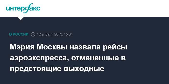 Москва. 12 апреля. INTERFAX.RU - Департамент транспорта и развития дорожно-транспортной инфраструктуры Москвы уточнил, какие именно рейсы аэроэкспресса отменят в выходные, 13 и 14 апреля.