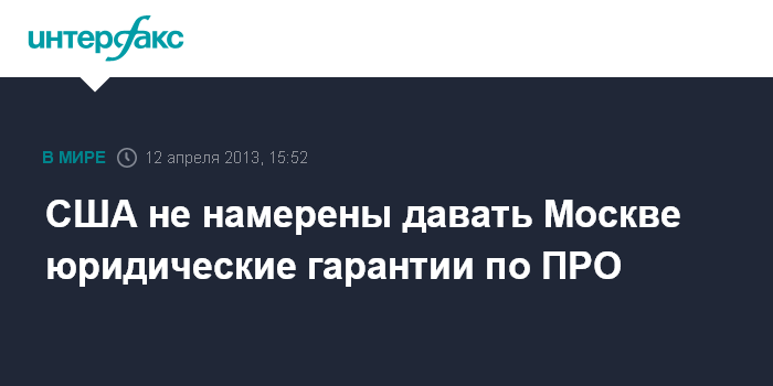 "Со своей стороны Россия настаивает на предоставлении ей юридически обязывающих гарантий того, что наша система ПРО не угрожает ее стратегическим силам сдерживания. Мы полагаем, что не юридические гарантии, а сотрудничество с нами было бы наилучшим способом убедиться в том, что ПРО США и НАТО в Европе не угрожает стратегическим силам сдерживания РФ", - подчеркнул американский дипломат.