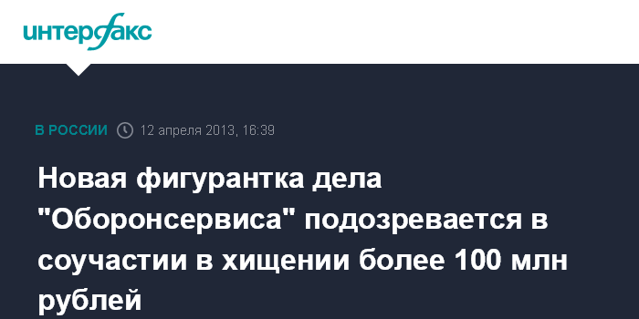 По версии следствия, в начале 2012 г. Егорова зарегистрировала на себя в Москве и Санкт-Петербурге четыре коммерческие организации и заняла в них должности учредителя и генерального директора. На протяжении года на счета указанных организаций от структур "Оборонсервиса" поступило более 100 млн рублей, часть денег обналичивалась и присваивалась, другая переводилась на счета подконтрольных фирм.