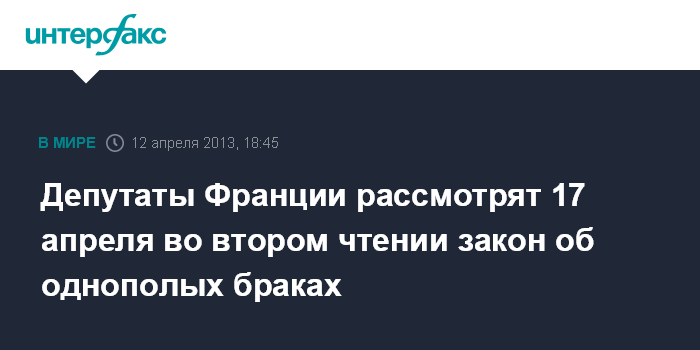 Париж. 12 апреля. INTERFAX.RU - Нижняя палата французского парламента 17 апреля начнет рассмотрение во втором чтении законопроекта, разрешающего гомосексуальным парам официально вступать в брак и усыновлять детей, заявил в пятницу журналистам министр-делегат по связям с парламентом Ален Видали.