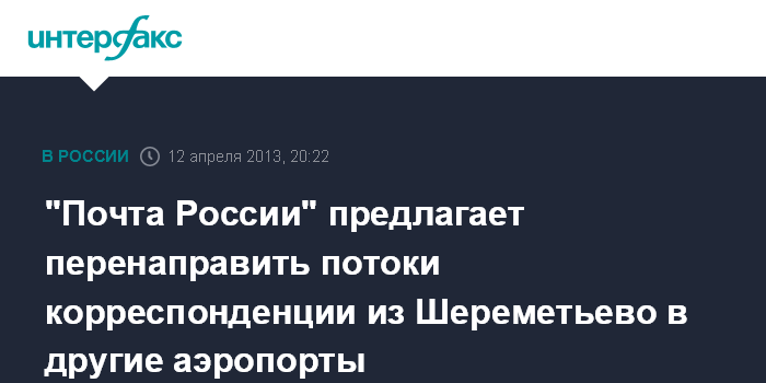 Москва. 12 апреля. INTERFAX.RU - ФГУП "Почта России" предложила иностранным почтовым службам использовать для перевозки отправлений рейсы, прибывающие в международные аэропорты "Внуково", "Домодедово" и "Пулково" вместо тех, что должны были прилетать в "Шереметьево", говорится в сообщении ФГУП.