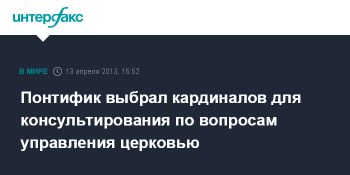 Рим. 13 апреля. INTERFAX.RU - Папа Римский Франциск в субботу учредил группу из восьми кардиналов с целью проведения реформ и консультирования по вопросам управления католической церковью, говорится в заявлении, опубликованном в субботу в Ватикане. В частности, кардиналы будут редактировать положения апостольской конституции Римской курии.