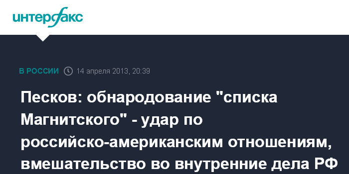 Москва. 14 апреля. ИНТЕРФАКС - Пресс-секретарь президента РФ Дмитрий Песков назвал обнародование американской стороной так называемого "списка Магнитского" ударом по двусторонним отношениям и прямым вмешательством во внутренние дела РФ.