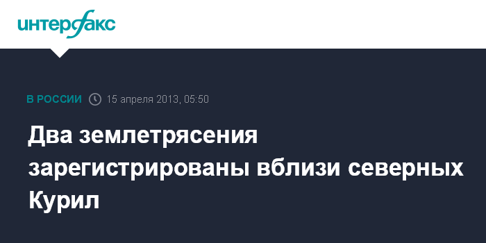 Южно-Сахалинск. 15 апреля. ИНТЕРФАКС - ДАЛЬНИЙ ВОСТОК - Два землетрясения зафиксированы в воскресенье утром в Тихом океане вблизи северных Курил Сахалинской области, сообщает пресс-служба Дальневосточного регионального центра (ДВРЦ) МЧС.