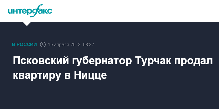 Москва. 15 апреля. INTERFAX.RU - Губернатор Псковской области Андрей Турчак избавился от квартиры в Ницце, вокруг которой разгорелся скандал после публикации сведений о ней блогером Алексеем Навальным, пишут "Известия" в понедельник. "Квартира в Ницце была продана двумя лотами: французской и российской семьям", - заявил изданию Турчак.
