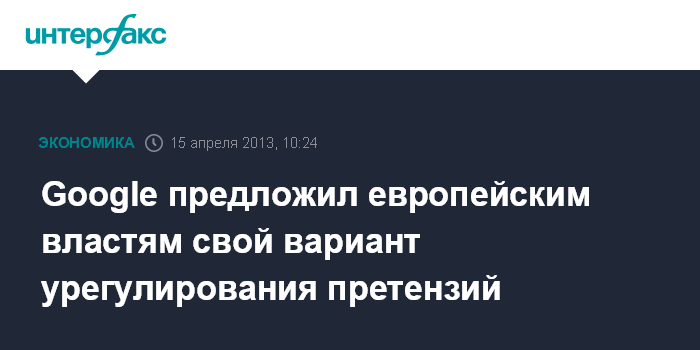 Нью-Йорк. 15 апреля. INTERFAX.RU - Интернет-гигант Google Inc. предложил регуляторам Европейского союза соглашение, которое сняло бы опасения властей в отношении злоупотребления компании своим доминирующим положением на рынке интернет-рекламы, пишет газета The Wall Street Journal со ссылкой на информированные источники.