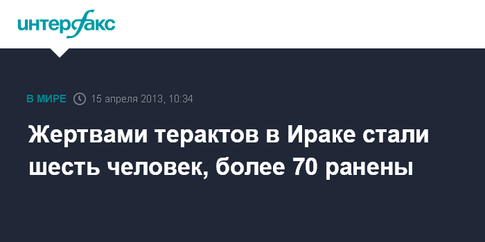 Багдад. 15 апреля. INTERFAX.RU - Серия терактов в Ираке в понедельник привела к гибели шести человек, сообщили местные медики. Кроме того, по их данным, 74 человека получили ранения.