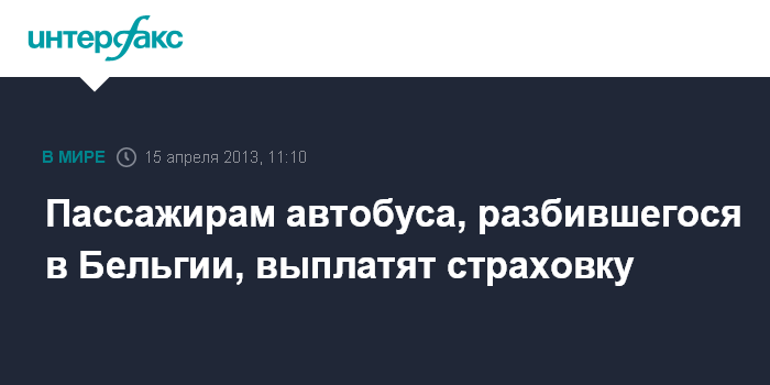 Москва. 15 апреля. INTERFAX.RU - Всем пассажирам, находившимся в автобусе, разбившемся в Бельгии, будет выплачена страховка в полном объеме, сообщила порталу "Интерфакс-Туризм" начальник отдела регулирования убытков страховой компании МСК Анна Гайдук в понедельник.