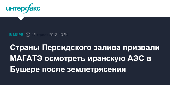 Дубай. 15 апреля. INTERFAX.RU - Совет сотрудничества государств Персидского залива (ССГПЗ) обратился с призывом к МАГАТЭ направить в Иран группу экспертов для осмотра реакторов на АЭС в Бушере после землетрясения, сообщает в понедельник саудовская газета Asharq Alawsat.