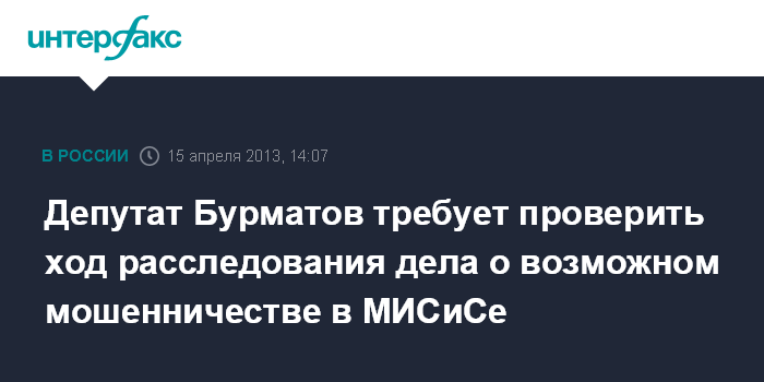 Москва. 15 апреля. INTERFAX.RU - Депутат Госдумы России от "Единой России" Владимир Бурматов направит запросы в МВД, Следственный комитет и Генпрокуратуру с требованием проверить сведения СМИ о возможном незаконном перечислении бюджетных средств на реконструкцию Московского института стали и сплавов (МИСиС) в то время, когда его ректором был нынешний министр образования Дмитрий Ливанов.