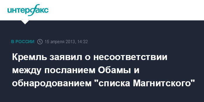 Кремль заявил о несоответствии между посланием Обамы и обнародованием "списка Магнитского"