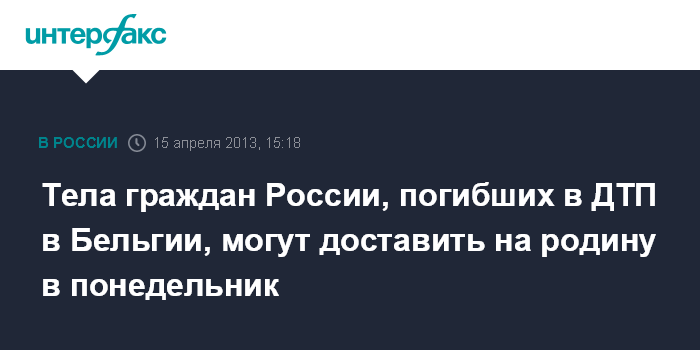 Москва. 15 апреля. INTERFAX.RU - Репатриация тел трёх граждан РФ, погибших в ДТП в Бельгии, возможно, будет осуществлена уже в понедельник, сообщила порталу "Интерфаксу" пресс-секретарь Ростуризма Ирина Щеголькова.