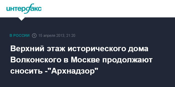 Москва. 15 апреля. INTERFAX.RU - Снос верхнего этажа дома князя Волконского на улице Воздвиженка в Москве возобновлен, сообщил координатор общественного движения "Архнадзор" Юрий Егоров.