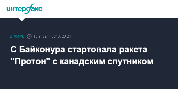 Москва. 15 апреля. INTERFAX.RU - Ракета-носитель "Протон-М" с разгонным блоком "Бриз-М" и канадским телекоммуникационным спутником Anik G1 стартовала с космодрома Байконур (Казахстан), сообщили "Интерфаксу" в пресс-службе Роскосмоса.