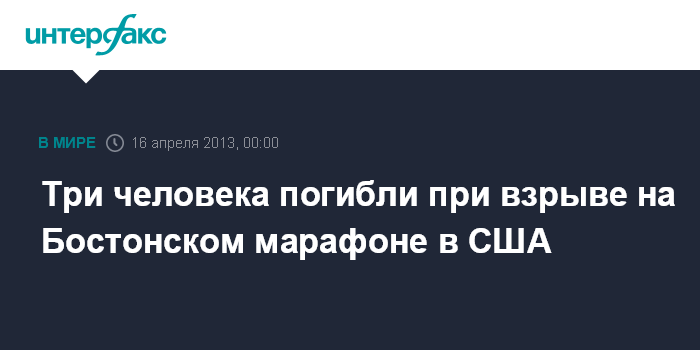 Вашингтон. 16 апреля. INTERFAX.RU - По меньшей мере три человека погибли на финишной черте Бостонского марафона в США, где в понедельник прогремело два взрыва, сообщает Fox News.