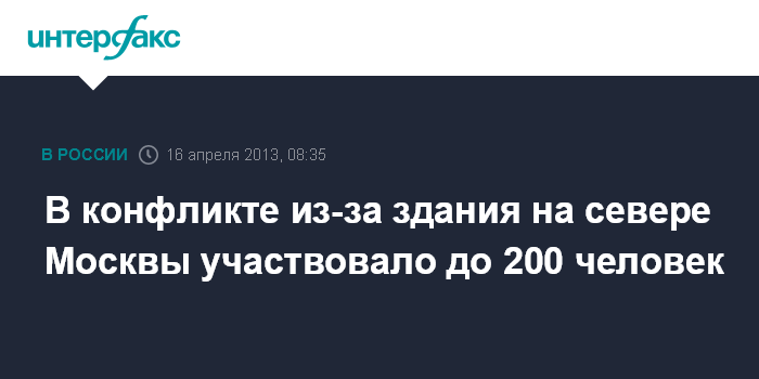 Москва. 16 апреля. INTERFAX.RU - До 200 человек участвовало в понедельник в конфликте, связанном с имущественным спором за офисное здание на севере Москвы, сообщили "Интерфаксу" во вторник в пресс-службе столичного главка МВД.