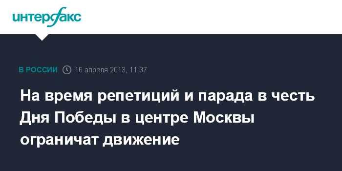 Москва. 16 апреля. INTERFAX.RU - Движение транспорта на ряде улиц в центре Москвы будет ограничено в связи с проведением репетиций и военного парада в честь Дня Победы, сообщает официальный портал мэра и правительства столицы со ссылкой на ГУП "Мосгортранс".