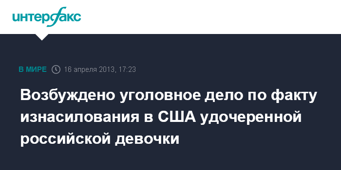 Москва. 16 апреля. INTERFAX.RU - Следственный комитет России возбудил уголовное дело по факту насильственных действий сексуального характера в США в отношении удочеренной в 2002 году в России девочки.