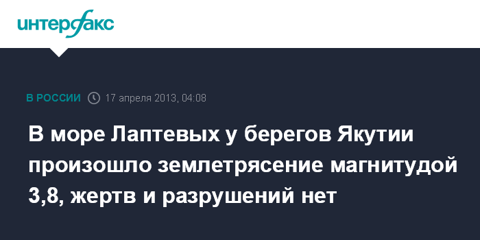 Якутск. 17 апреля. ИНТЕРФАКС-ДАЛЬНИЙ ВОСТОК - В акватории моря Лаптевых у северных берегов Якутии ученые-сейсмологи зафиксировали землетрясение, магнитуда которого составила 3,8, сообщает в среду Дальневосточный региональный центр МЧС (ДВРЦ).