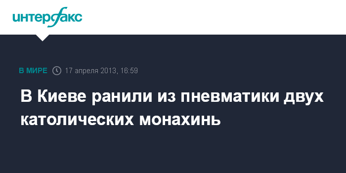 Киев. 17 апреля. INTERFAX.RU - В Киеве на месте строительства католического храма св. Франциска Ассизского на Оболони стреляли во вторник из пневматического оружия в двух монахинь, сообщает в среду Католический медиа-центр. Как отмечают в медиа-центре, инцидент произошел во время молитвы - в результате пострадали сестры Розалия и Терезиана из Конгрегации сестер святого Иосифа.