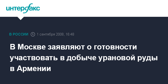 Москва. 1 сентября. INTERFAX.RU - Россия готова принять участие в доразведке и добыче запасов урановой руды в Армении и строительстве там нового атомного энергоблока, сообщил источник в Кремле.