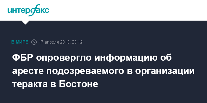 Вашингтон. 18 апреля. INTERFAX.RU - Федеральная полиция в Вашингтоне и Бостоне опровергла появившиеся в СМИ сообщения об аресте подозреваемого в организации взрывов на марафоне в Бостоне, сообщает в среду телеканал CNN.