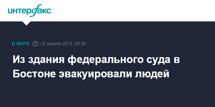 Лондон. 18 апреля. INTERFAX.RU - Американская полиция провела эвакуацию в здании федерального суда в Бостоне, где в понедельник в результате взрывов на финишной прямой ежегодного марафона погибли три человека и пострадали 180.