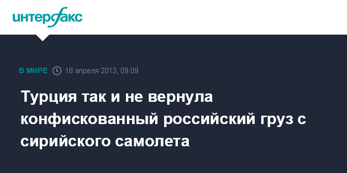 Москва. 18 апреля. INTERFAX.RU - Турция до сих пор не вернула задержанный ею российский груз, перевозившийся на борту самолета сирийской авиакомпании, который в октябре турецкие военные посадили в Анкаре, пишет в четверг "Коммерсант".