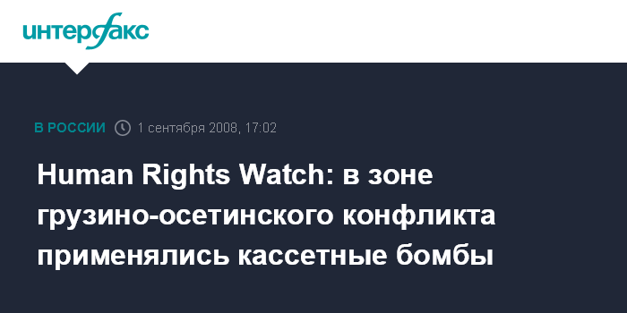 Москва. 1 сентября. INTERFAX.RU - Грузинские военные использовали кассетные боеприпасы во время атаки в Южной Осетии, утверждают в международной правозащитной организации Human Rights Watch. "В прошлый уик-энд Грузия заявила "Хьюман райтс уотч", что использовала кассетные боеприпасы в нескольких районах", - сказала в понедельник представитель известной международной правозащитной организации Бонни Дочерти, специализирующаяся на вопросах, связанных с вооружением.