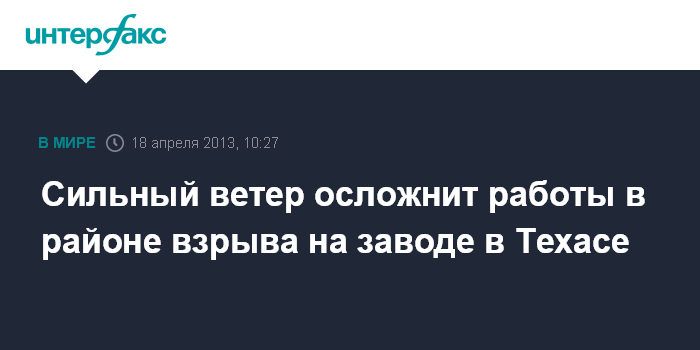 Вашингтон. 18 апреля. INTERFAX.RU - В американском городе Уэст штата Техас, где произошел взрыв на заводе удобрений, ожидаются довольно сильные бури, что усложнит работу пожарных, сообщает в четверг местный телеканал CNN.