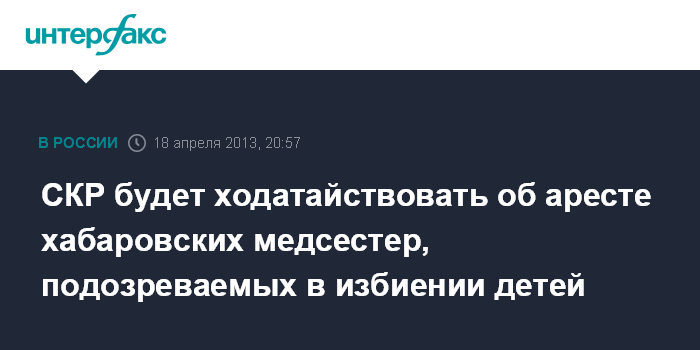 Москва. 18 апреля. INTERFAX.RU - Председатель СКР Александр Бастрыкин поручил следственному управлению по Хабаровскому краю ходатайствовать об аресте медсестер, подозреваемых в жестоком избиении детей, сообщает СКР.
