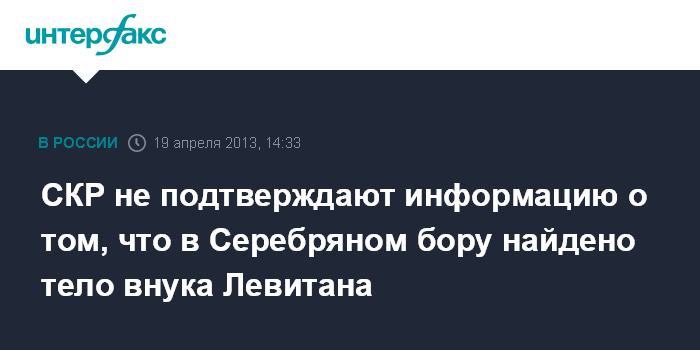 Москва. 19 апреля. INTERFAX.RU - Столичный главк СКР организовал доследственную проверку по факту обнаружения в Серебряном бору тела мужчины с документами на имя Бориса Сударикова, но при этом не подтверждает, что погибший был внуком знаменитого радиодиктора Юрия Левитана.
