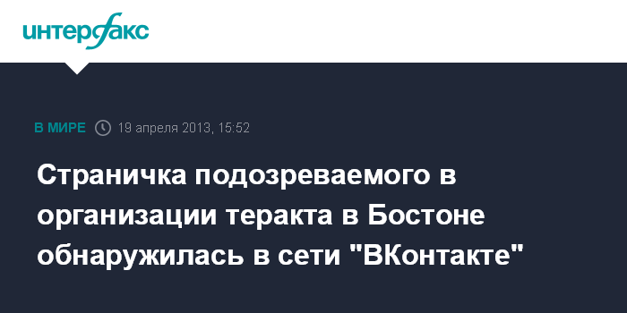 Москва. 19 апреля. INTERFAX.RU - Пользователи Интернета нашли страницу в социальной сети "Вконтакте" подозреваемого в организации взрывов в Бостоне.